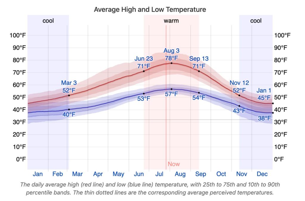 Gig Harbor has a marine west coast climate: Warm and dry summers, transitional springs and autumns, and cool and wet winters, with occasional snow. The annual high and low temperatures of Gig Harbor are 59.3 °F and 44.8 °F, respectively, making for an average of 52.05 °F. Over the course of the year, the temperature typically varies from 38°F to 78°F and is rarely below 29°F or above 87°F.