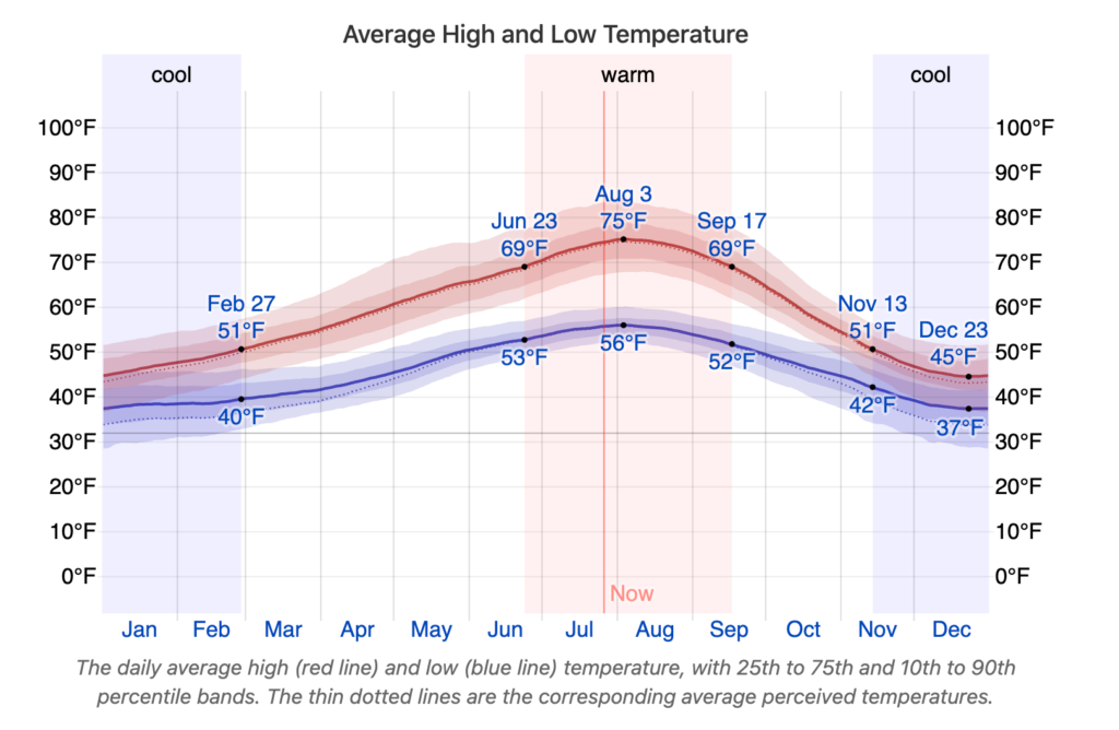 The cool season lasts for 3.5 months, from November 13 to February 27, with an average daily high temperature below 51°F. The coldest day of the year is December 23, with an average low of 37°F and high of 45°F.