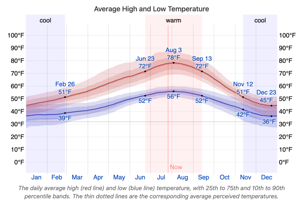 The cool season lasts for 3.5 months, from November 12 to February 26, with an average daily high temperature below 51°F. The coldest day of the year is December 23, with an average low of 36°F and high of 45°F.