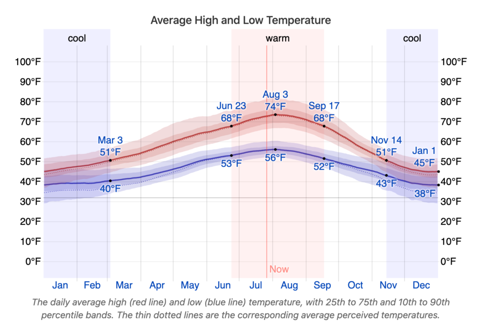 Port Townsend’s warm season lasts for 2.8 months, from June 23 to September 17, with an average daily high temperature above 68°F. The hottest day of the year is August 3, with an average high of 74°F and low of 56°F.